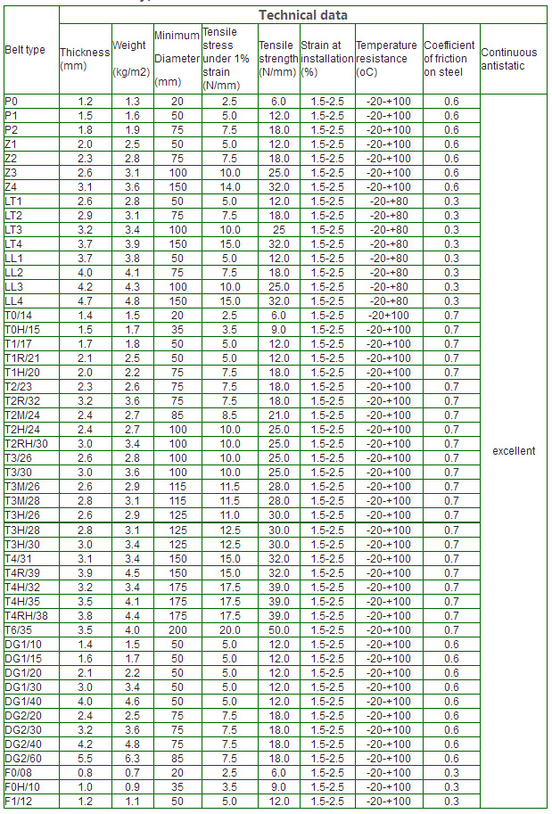 T Series: High-efficiency double-drive belts especially suitable for high-speed tangential drive and power transmission in textile industry such as being used on O.E. spinning frames, two-for-one twisters, draw-texturing machines, novelty twisters; they are also used in cards, drawing, roving and ring spinning frames; such belts can be used for power transmission in paper-bobbin making machines.